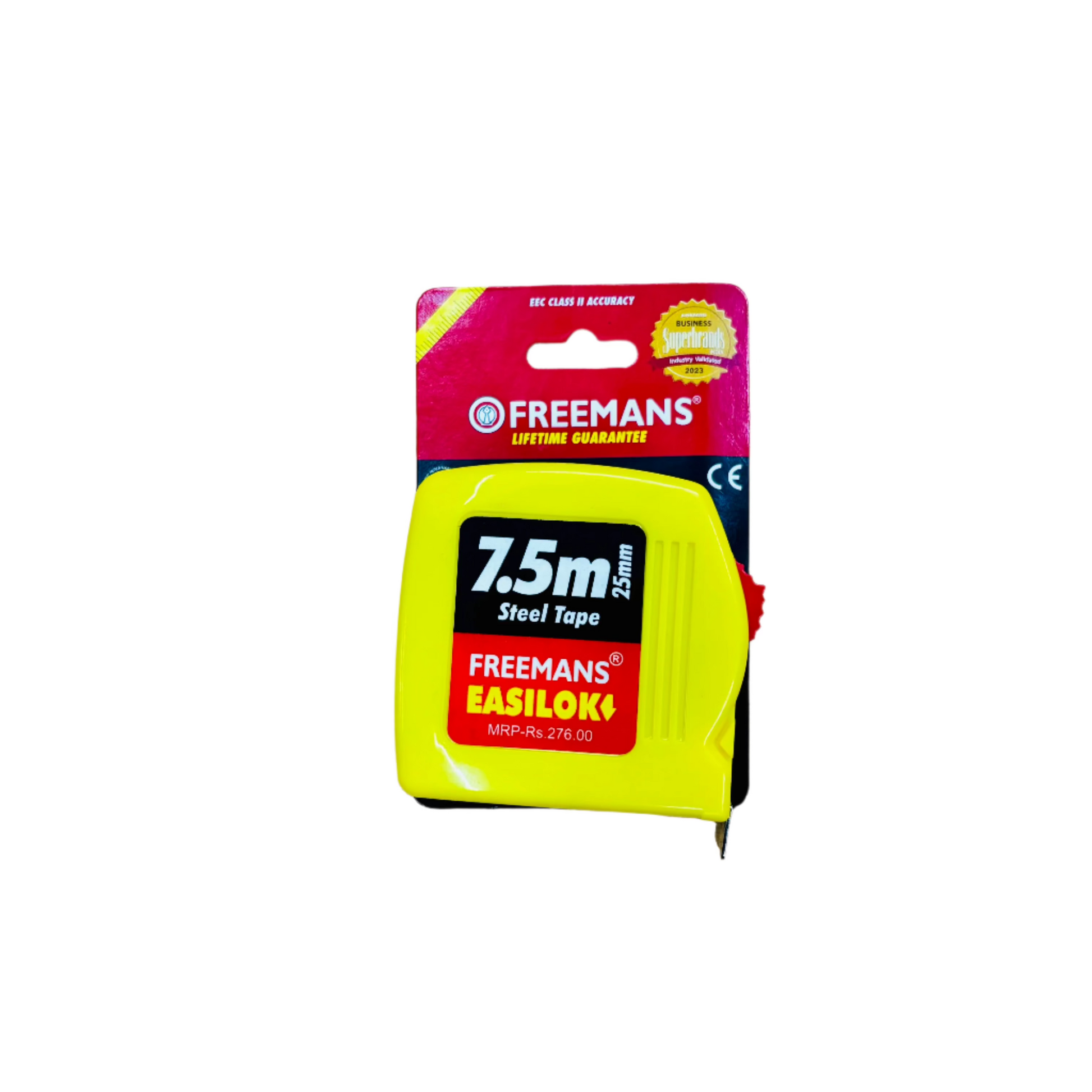 फ्रीमैन्स ईज़ीलोक 7.5mx 25mm स्टील मापने वाला टेप एक विश्वसनीय और टिकाऊ उपकरण है जिसे विभिन्न अनुप्रयोगों में सटीक माप के लिए डिज़ाइन किया गया है। भारत में निर्मित, यह टेप मापक मज़बूत बनावट और उपयोगकर्ता-अनुकूल विशेषताओं का संयोजन है, जो इसे पेशेवरों और DIY उत्साही लोगों, दोनों के लिए उपयुक्त बनाता है।